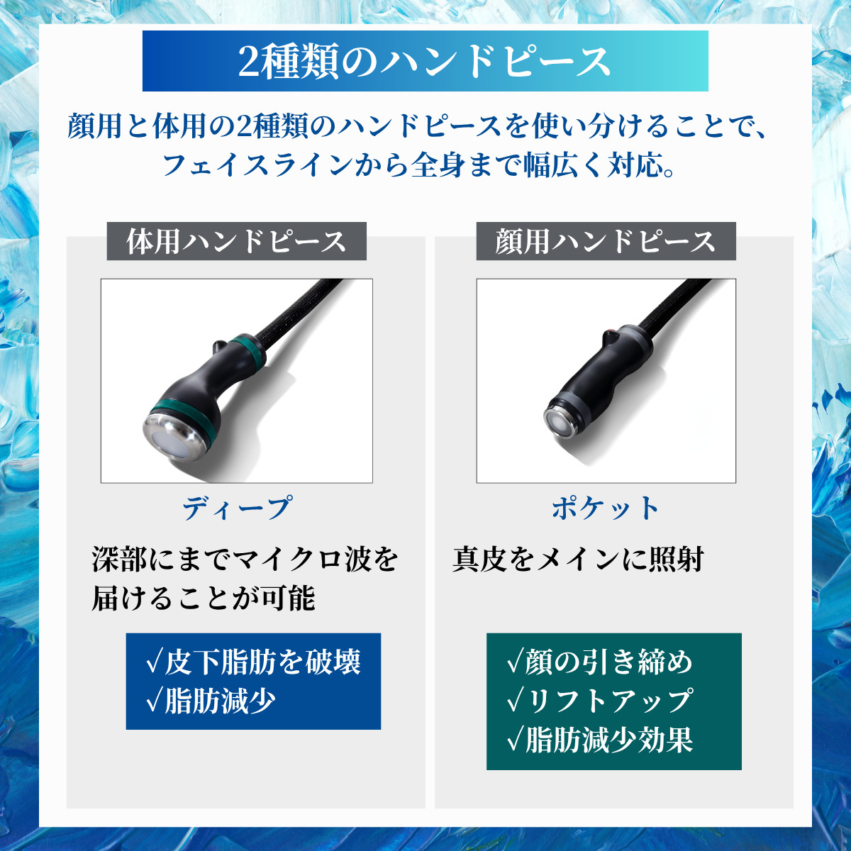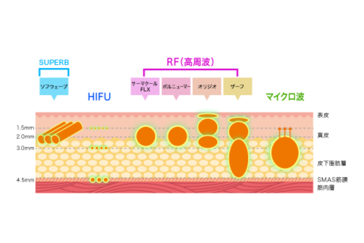| 主な作用層 | 脂肪層+真皮層 | 真皮層 | SMAS層・真皮層 | 真皮層(浅層) |