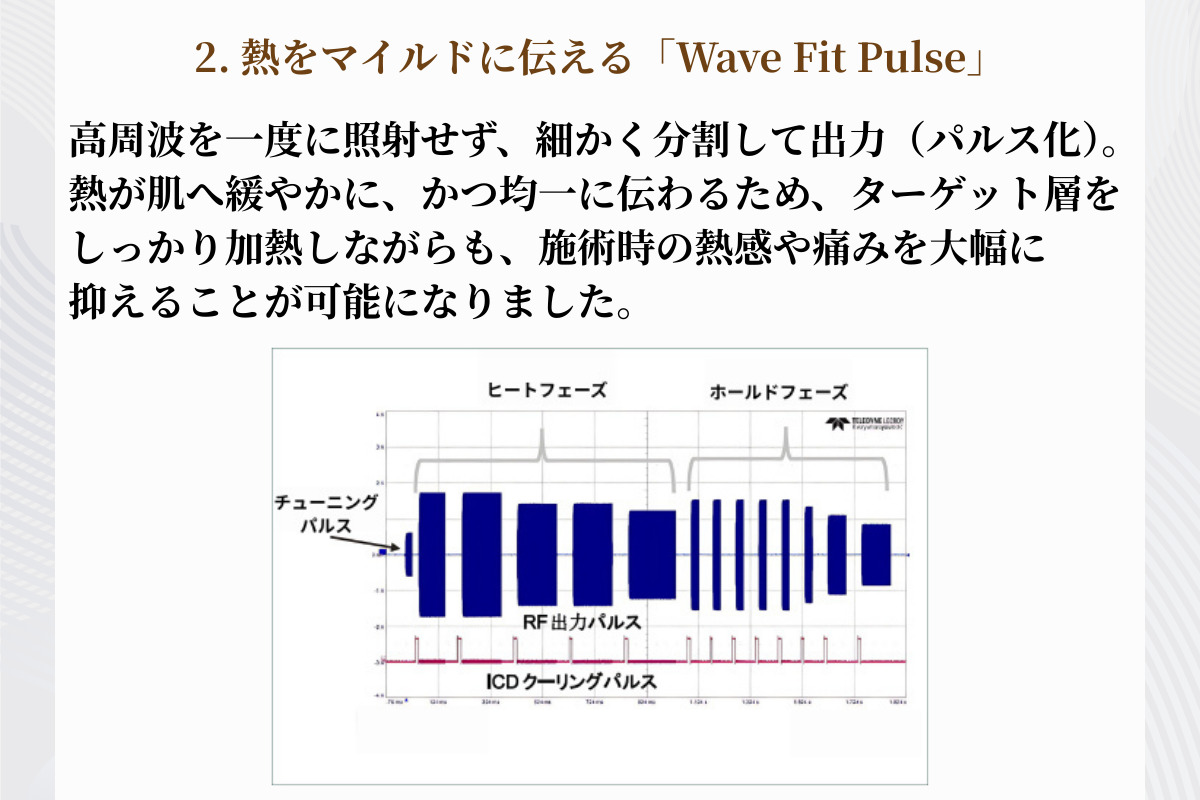 専用ハンドピースを使用し、6.78MHzと2MHzのデュアルモノポーラRFを照射します。 施術時間は全顔で約20〜30分。麻酔は不要で、快適にお受けいただけます。 施術直後から引き締め感を実感でき、さらにコラーゲン生成が進むことで、数週間〜数か月かけてリフトアップ効果が高まります。